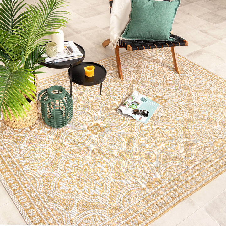 Der Outdoor-Teppich – Summer Oriental Gelb ist ein trendiger, pflegeleichter Teppich für den Innen- und Außenbereich. Wer behauptet, hübsch und praktisch ließen sich nicht vereinen, liegt also völlig falsch. Das einzigartige Muster und die frischen Farben dieses Teppichs bringen einen Schuss Lebendigkeit in Ihr Interieur und Ihren Garten. Garten? Ja, genau, Garten! Denn dieser Teppich kann auch als Outdoor-Teppich verwendet werden. Er ist nämlich wasserfest und kann im Sommer einfach draußen liegen bleiben. Der Grund ist, dass der Teppich komplett aus Polypropylen gefertigt ist, ein überraschend weiches und wasserfestes Material. Einen unverhofft verregneten Sommer übersteht es mit Leichtigkeit. Aber auch im Hause hat dieser Teppich viele Vorteile. Das liegt unter anderem daran, dass sich das Material leicht reinigen lässt. Also perfekt geeignet für einen Haushalt mit Kindern und/oder Haustieren!