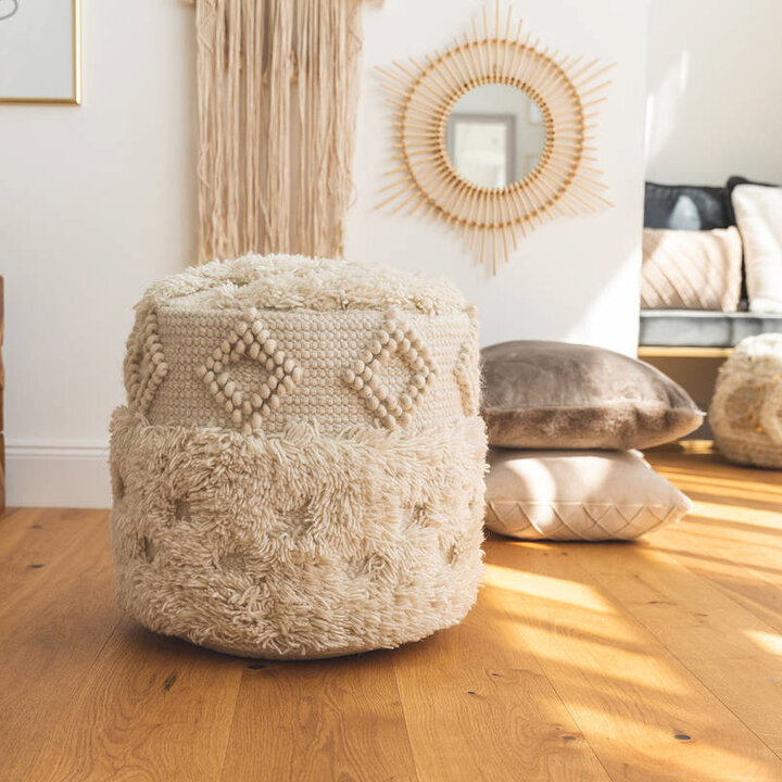 Boho Pouf - Basai 125 Creme ist ein attraktives Möbelstück, das jedem Raum einen Hauch von Komfort und Stil verleiht. Mit einer Höhe und einem Durchmesser von 35 cm ist der Pouf Basai kompakt genug, um ihn in jedem Raum zu platzieren. Die Polsterung des Poufs besteht aus einer natürlichen und langlebigen Mischung aus 90% neuseeländischer Wolle und 10% Baumwolle. Die warme und gemütliche Atmosphäre wird durch das natürliche Material und die natürliche Farbpalette noch verstärkt. Das Innere des Poufs Basai ist mit EPS-Perlen gefüllt, die für ein stützendes und weiches Sitzerlebnis sorgen. Trotz seiner bescheidenen Größe kann der Pouf Basai mit einem Gewicht von bis zu 75 kg belastet werden. Der Hocker Basai kann sowohl als zusätzliche Sitzgelegenheit als auch als praktischer Beistelltisch oder Fußhocker dienen. Ideal!